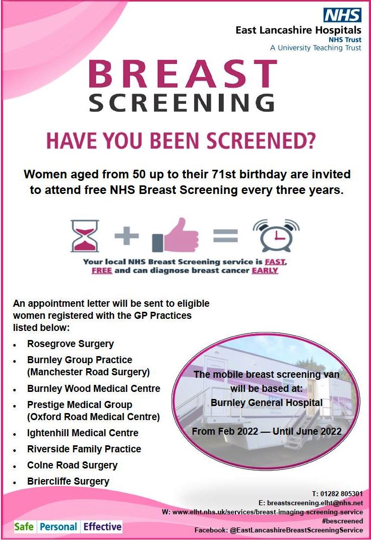 Women aged from 50 up to their 71st birthday are invited to attend free NHS Breast Screening every three years. The mobile breast screening van will be based at Burnley General Hospital from February 2022 until June 2022. An appointment letter will be sent to eligible women registered with the GP Practice listed below:
